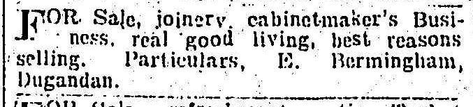 Ned Bermingham worked as a carpenter and cabinet maker throughout his entire adult life in the Fassifern Valley district. He and Catherine had six children, one of whom was my father, John Francis Bermingham.