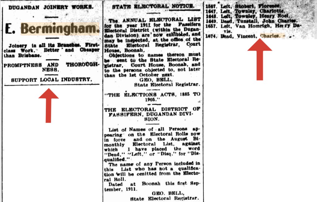 In an interesting twist, I managed to uncover a newspaper advertisement placed by Ned in a Brisbane newspaper in 1912, offering the business for sale—just two years after he had taken it over from Charles Vincent in 1910. Could Ned have been getting cold feet about running the enterprise, especially following Vincent’s successful management of the joinery works he had established? It’s possible that Ned found himself in debt after purchasing the business and was testing the market in case he feared financial difficulties ahead. It is also notable that he chose to advertise the sale in the Brisbane press rather than in the local Boonah or Ipswich papers. In any case, the sale never went ahead.