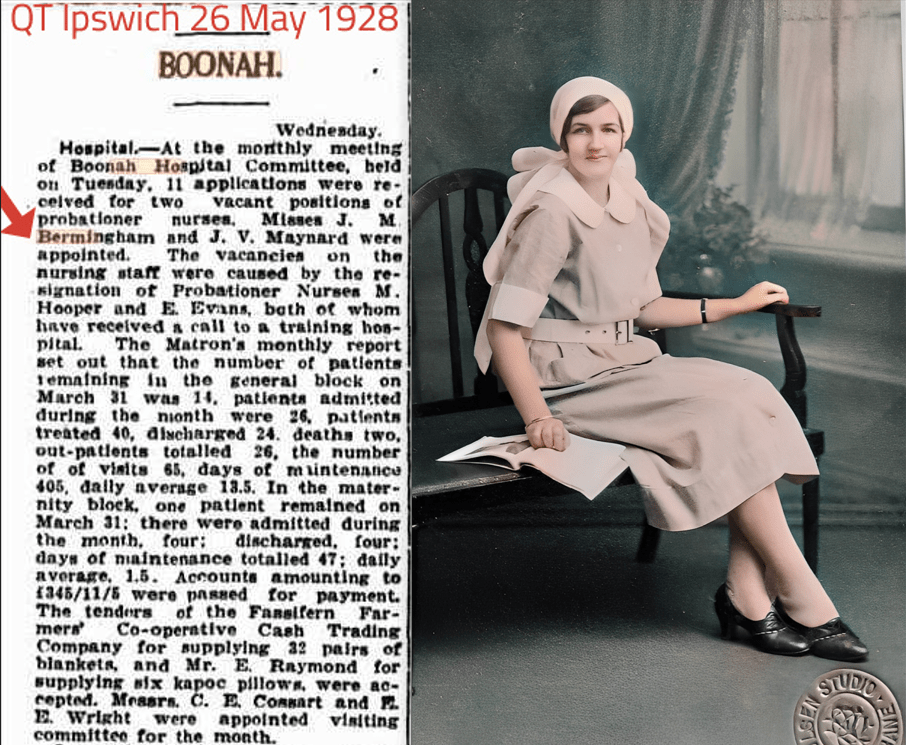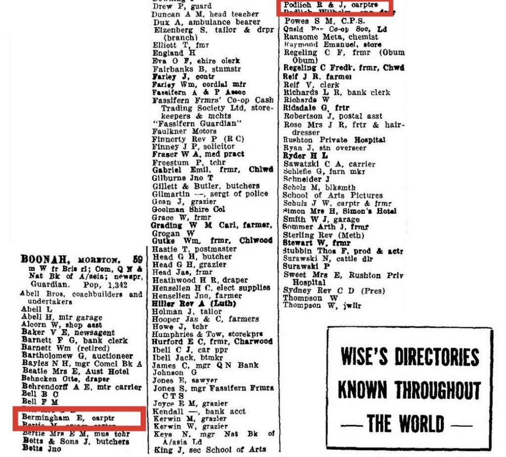 Both Ned Bermingham and Rudolph Podlich were employed by Charles Vincent as carpenters in the early 1900s. By the time Simons Hotel was completed in 1902, Ned had finished his apprenticeship. Ned and Rudi Podlich were likely close friends, having completed their carpentry apprenticeships under Vincent’s guidance. After Ned’s death in 1944, the Podlich and Bermingham families lived next door to each other on Macquarie Street, Boonah.
