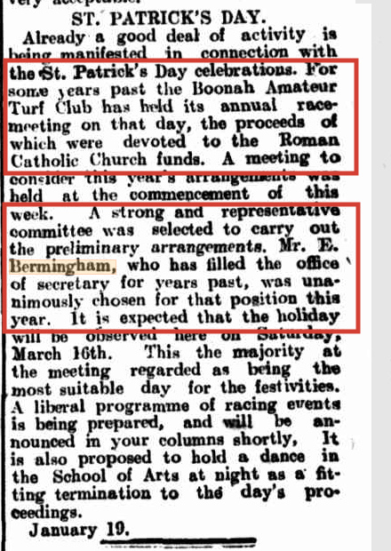 Ned’s active involvement with local sporting pursuits also had him being the secretary of the Boonah Amateur Turf Club for many years. I’m sure there was no conflict of interests with the proceeds of the race meeting being donated to the local Catholic Church.😃