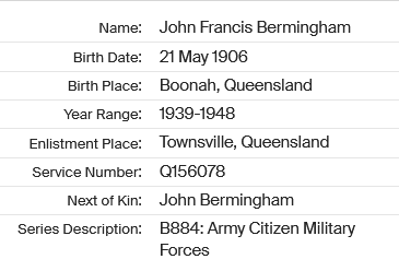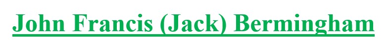 John Francis Bermingham died on October 8, 1984, at the age of 78. Both Jack and Vera have memorial headstones in the family plot at Boonah Cemetery.