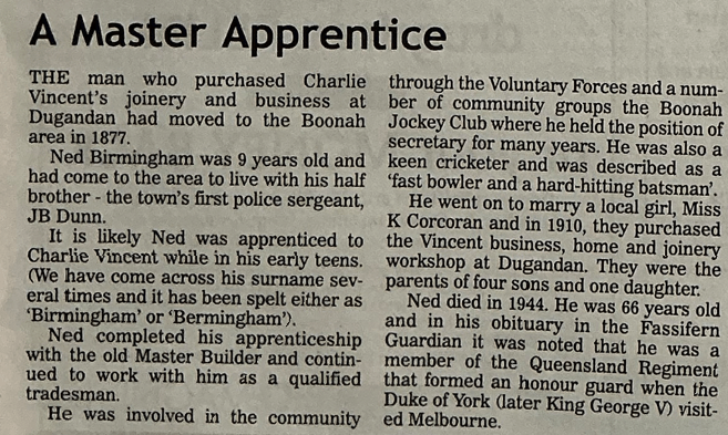 After completing his schooling in Boonah in the early 1890s, Ned received assistance from Senior Constable John Dunn, who helped him secure an apprenticeship in cabinetmaking and carpentry. Dunn arranged for him to train under local master builder Charlie Vincent, owner of the Dugandan Joinery Works.