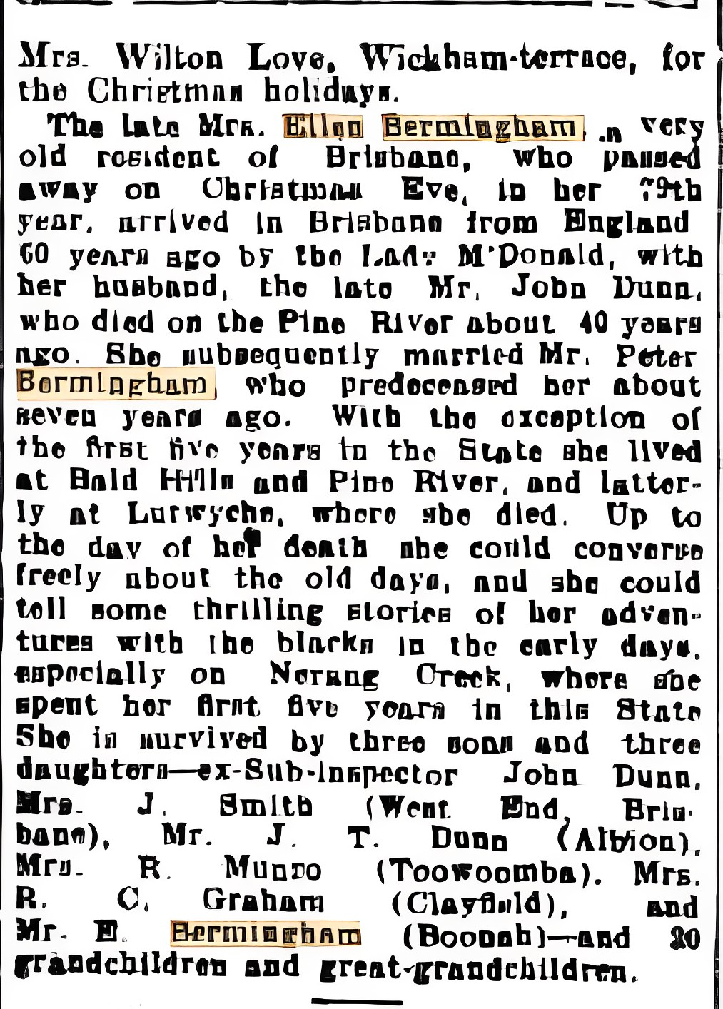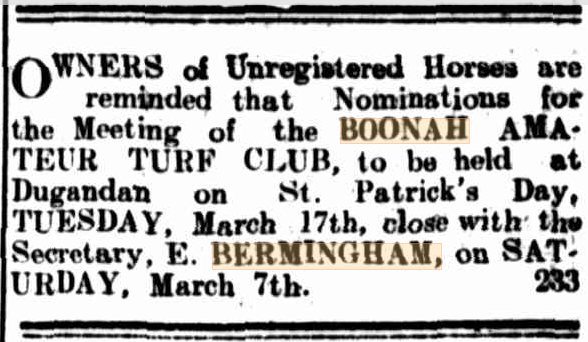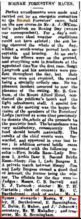Ned Bermingham, at the age of 9, left South Pine and moved to Boonah in 1887. His half-brother, John Dunn Jnr (from Ellen’s first marriage to John Dunn Snr, 1832-1875), was appointed to be the first policeman stationed at Boonah. John Bowen Dunn served as the police officer at Boonah until 1895.