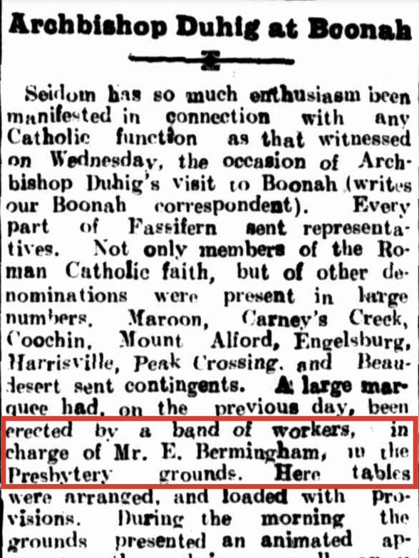 Edward Bermingham married Catherine Mary Corcoran on November 12, 1903, at the Catholic Church in Coopers Plains, on the southern outskirts of Brisbane. Their first child, Edward Joseph Bermingham, was born on June 24, 1904. The reason the wedding took place nearly 100 kilometers from the Fassifern Valley was likely because Catherine was in the early stages of pregnancy. At the time, the region—particularly the Catholic community in Boonah and the Fassifern Valley—was deeply conservative. To avoid local scrutiny and judgment, the couple and their families likely chose to marry away from the disapproving eyes of their home parish.