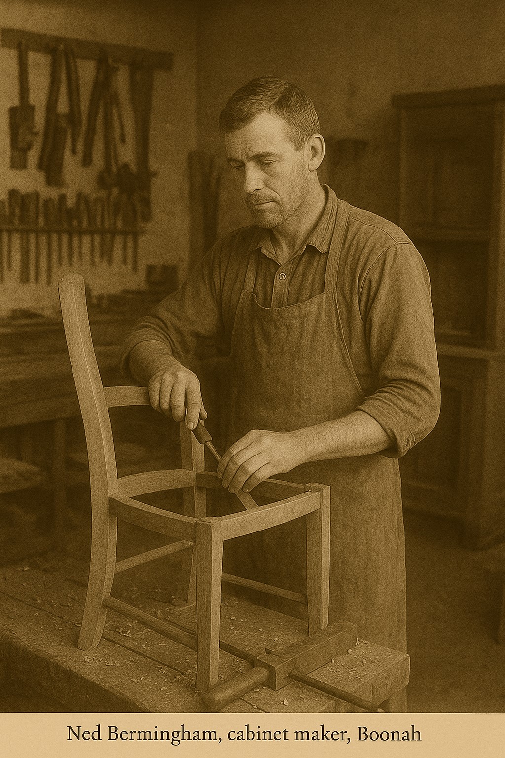After completing his schooling in Boonah in the early 1890s, Ned received assistance from Senior Constable John Dunn, who helped him secure an apprenticeship in cabinetmaking and carpentry. Dunn arranged for him to train under local master builder Charlie Vincent, owner of the Dugandan Joinery Works.