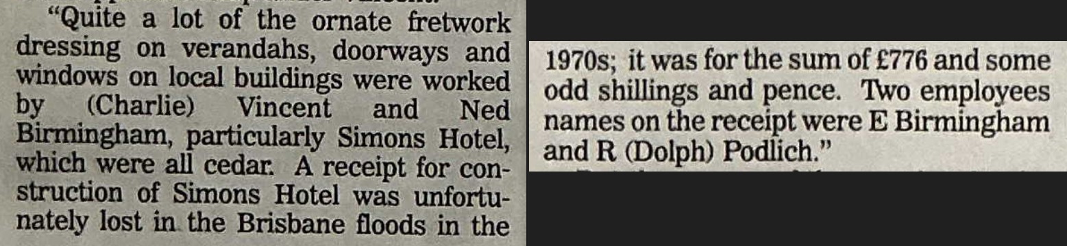Both Ned Bermingham and Rudolph Podlich were employed by Charles Vincent as carpenters in the early 1900s. By the time Simons Hotel was completed in 1902, Ned had finished his apprenticeship. Ned and Rudi Podlich were likely close friends, having completed their carpentry apprenticeships under Vincent’s guidance. After Ned’s death in 1944, the Podlich and Bermingham families lived next door to each other on Macquarie Street, Boonah.