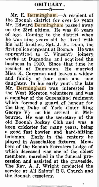 The above advertisement appeared in the Ipswich, Queensland Times in April 1945. I am not sure as to why the property was offered for auction in 1945, as Catherine Bermingham lived there until her death, twenty years later, in 1965, whereupon it was then auctioned off in a home & contents auction. I attended that auction as a kid with my Dad – John Francis Bermingham – Ned’s son.