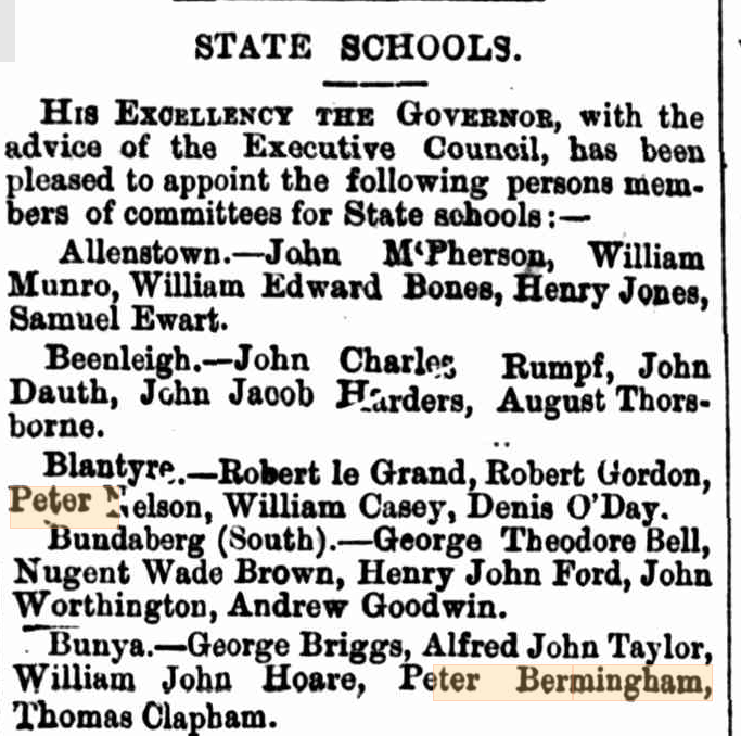Ellen obviously still had close contact with her children from the Dunn side of the family. Her son from her previous marriage to John Dunn (who had died in 1875), John Dunn Jnr was a police officer. It is a possibility that Peter may have had a checkered past and associated with some people who were known to the authorities. The Dunn’s may have been protecting their mother by pushing Peter out of the family circle. It happens in a lot of cases where the mother remarries shortly after the death of her husband, and the children for one reason or another, take an instant dislike of the new guy. All of this is supposition on my part, but I believe that it may have been the case here. Edward wasn’t particularly close to his father and kept in closer contact with his mother and his Dunn siblings as he got older. There are many inconsistencies & gaps in Peter’s life that don’t add up. I found this newspaper article from the Brisbane Telegraph of 11th March 1878. This is around the time that Peter & Ellens’s son, Edward was born – 17 January 1878. Bunya State School was approximately 2 km from Ellen’s farm. The Dunn kids would have gone to this school. These committees were the forerunners of modern-day School P & C Associations. Peter had been making an attempt to be part of the family, by being involved with the kids & helping out at their local school.
