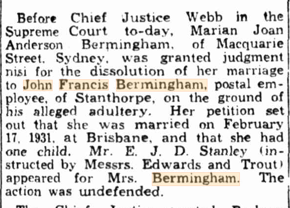 In early 1931, Jack married Marion Joan Anderson McGill at St Stephens Cathedral in Brisbane, the same church his grandparents, Peter and Ellen Bermingham were married in 54 years earlier. Later that year, they had a son, John Francis Leslie Bermingham, born at Goondiwindi in western Queensland. Sadly, the marriage didn’t last, with Joan disappearing & leaving Jack with his young son shortly after. As his mother had disappeared off the scene, young John was raised by his Aunties and Grandparents in the Fassifern Valley, while Jack was away working across the state.