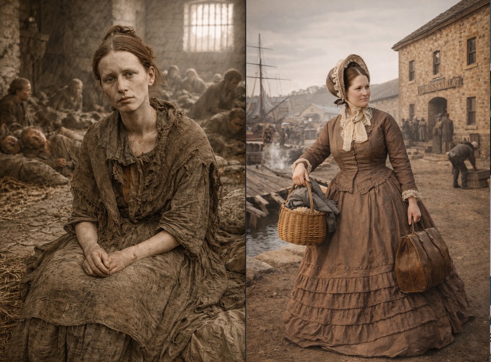This AI-enhanced photograph of Catherine Bradbury (Ryan) was created from the original taken in Toowoomba, circa 1876. It is a restored version of the image featured at the beginning of the article. The instructions I put into the AI chatbot were basic, just simple clearing of the image. No more than that. I wanted to see her as she was, with no contemporary enhancement. The original was the only surviving photograph of this remarkable woman. Nearly one hundred and fifty years later, I find it extraordinary to look through the lens of that moment and see my great-great-grandmother as she once sat in a Toowoomba photographer’s studio, around 1876, when she would have been about 42 years old. What an extraordinary life she lived! Catherine was among the many young Irish women from impoverished backgrounds who came to Australia as workhouse orphans, famine survivors, or convicts. These women built an enduring legacy that profoundly shaped the lives of future generations of Australian girls.