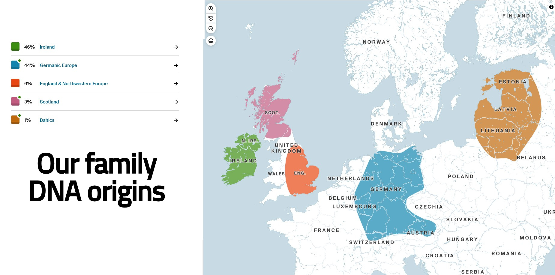 My Ancestry DNA results indicate that I am 46% Irish and 44% German, with the remaining 10% tracing back – to England -6%, Scotland -3%, and the Baltic region -1%. Based on my research into historical DNA patterns, these smaller percentages may reflect ancestral migration across Europe that occurred centuries ago & eventually ended up in either Ireland or Germany.