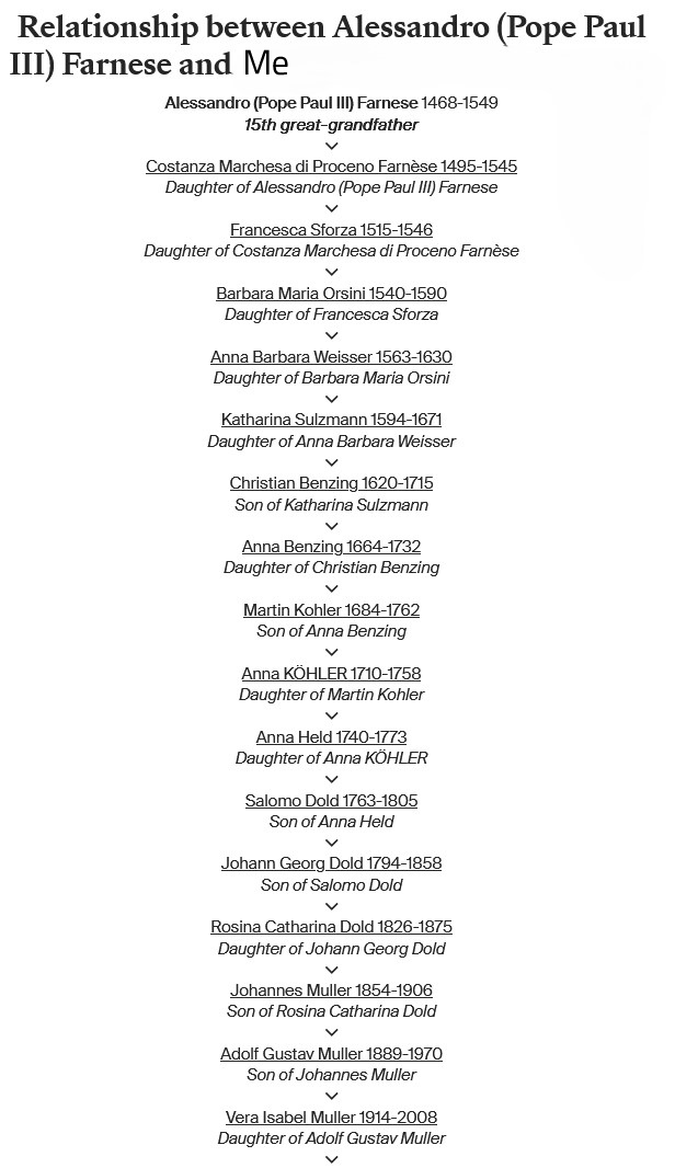 I have also discovered a connection to Alessandro Farnese (Pope Paul III), born on February 29, 1468, in Canino, Latium, in the Papal States, Italy, and who died on November 10, 1549, in Rome, Lazio. He and his mistress, Silvia Ruffini, are my 15th great-grandparents. Between approximately 1500 and 1510, they had at least four children, one of whom was Constanza Farnese. Three generations later, her descendants found their way to Germany, eventually connecting to the Dold family. Rosina Catharina Dold, my great-great-grandmother, is among their descendants.