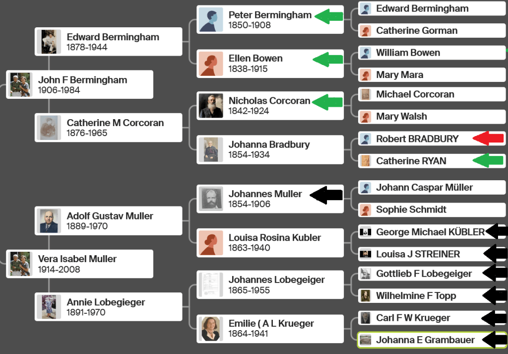My father’s Irish lineage lacks reliable records before the Great Famine of the 1840s. The oldest records on my father’s side come from a connection to England: my 15th great-grandparents, Sir Matthew Browne, MP of Betchworth (1469–1557), and Lady Fredeswith Guildford (1478–1525). These ancestors link to our only English relative, my great-great-grandfather and convict, Robert Bradbury.