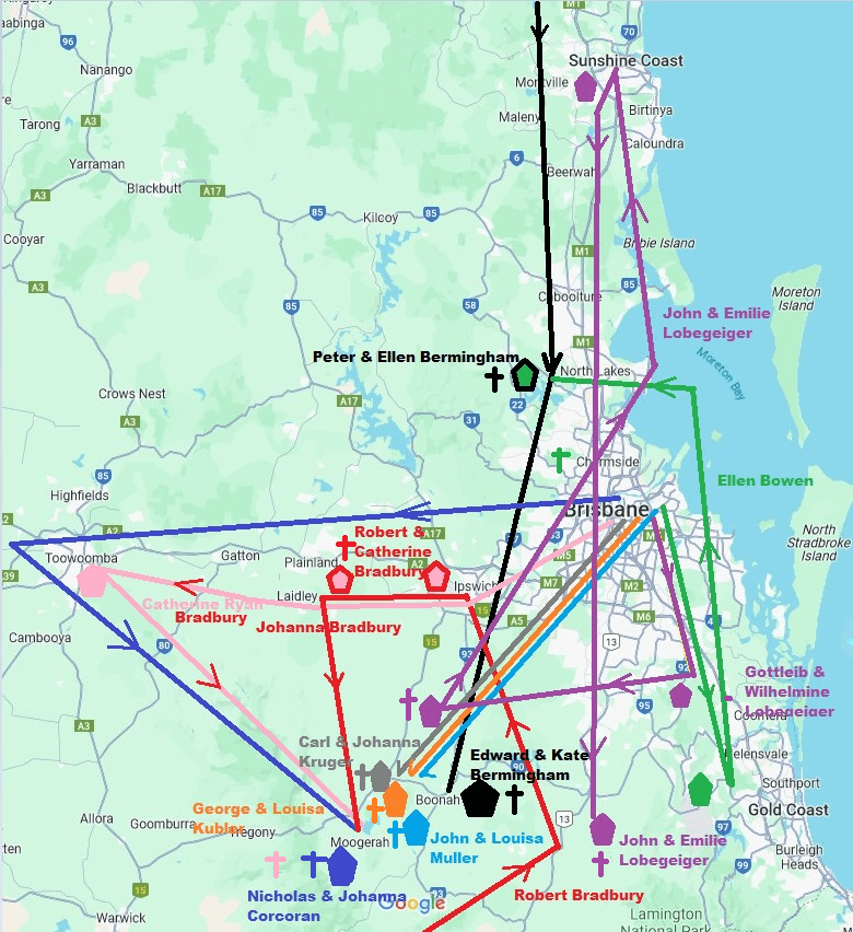 Family pathways our ancestors made on arrival in Australia. Robert Bradbury a convict transported to Australia for desertion was the first to arrive in 1832, coming up from Sydney. His future wife, Catherine Ryan arrived in Brisbane in 1852. Ellen Dunn/Bowen 1856, George & Louisa Kubler 1863, Gottleib & Wilhelmine Lobegeiger 1864, Nicholas Corcoran 1864, Carl & Johanna Krueger 1865, Peter Bermingham 1874, Johannes Muller 1879.