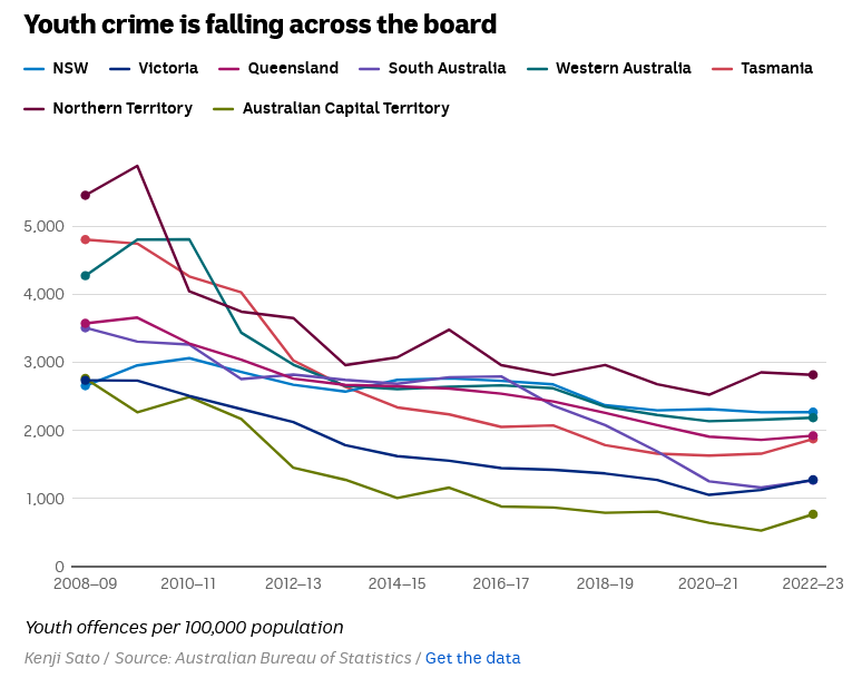 These claims are contradicted by official data sources that show rates of crime have plummeted in every state and territory in Australia to near record lows.