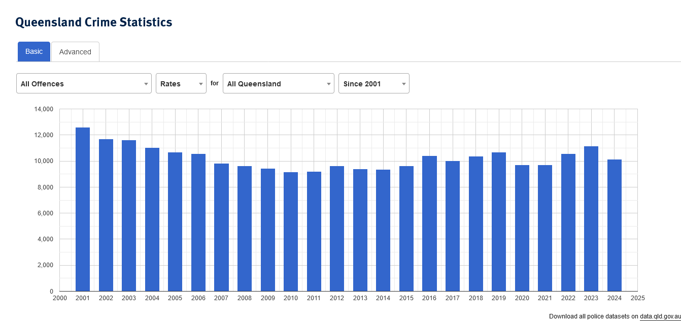 Let’s analyze these figures. In 2001, Queensland’s population was 3,670,500. By 2024, that number had grown to 5,560,452. Unless I’m misreading this graph, it appears that despite a significant increase in population—nearly two million more people—we’ve actually seen a considerable drop in the actual number and rates of criminal offenses during this period.
