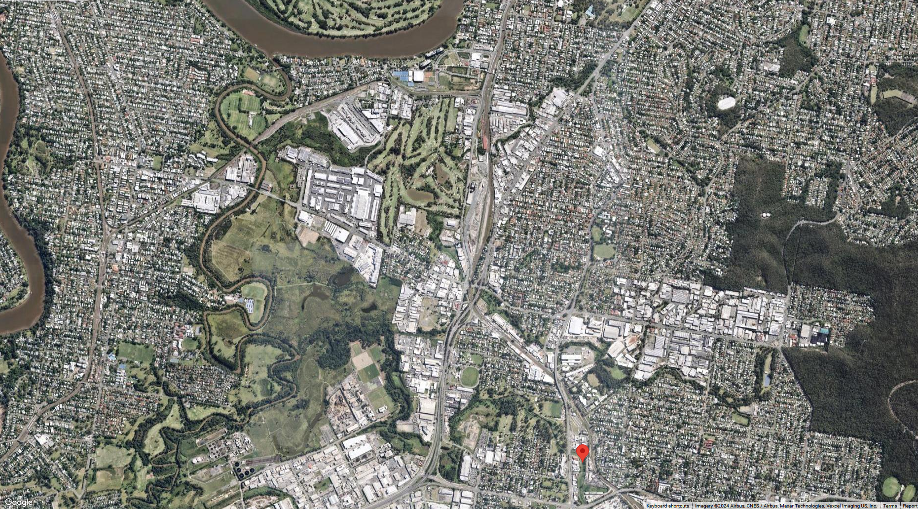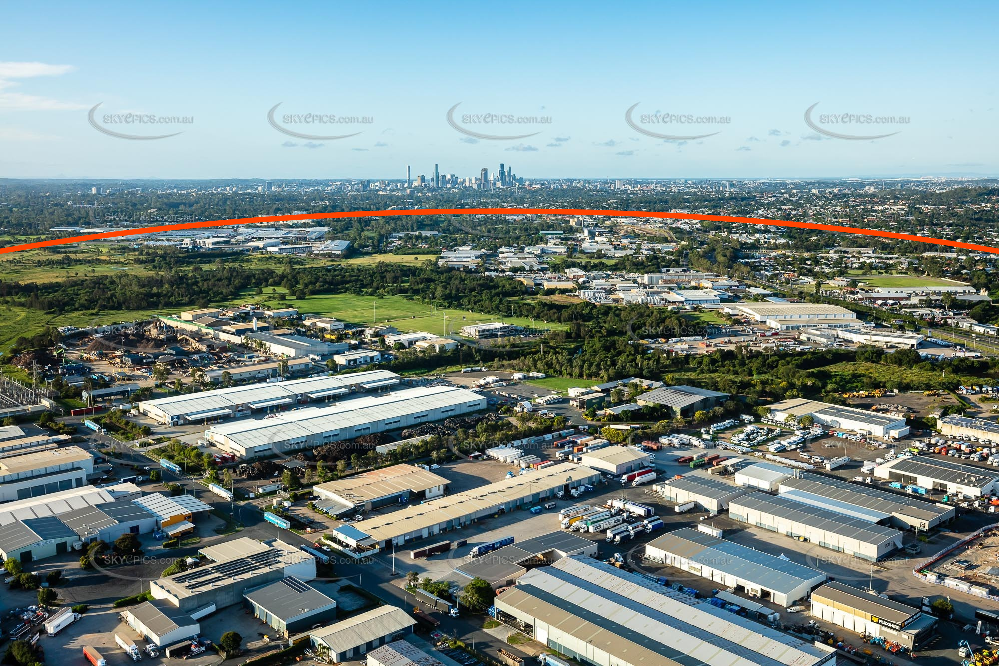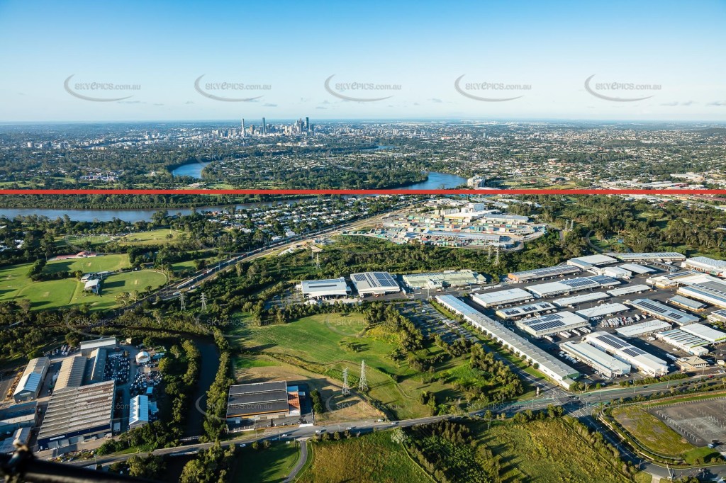 Looking above Rocklea Industrial area towards Brisbane CBD in background. Stable Swamp Creek in treeline running across centre of photo. Everything below red line goes under floodwater in extreme weather/flood event.