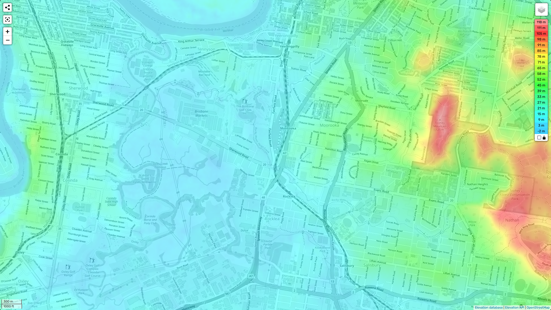 In the area where I grew up, Rocklea’s elevation was about 10 meters above sea level. The entire suburb was effectively built on a floodplain. The area shaded blue is all floodplain.