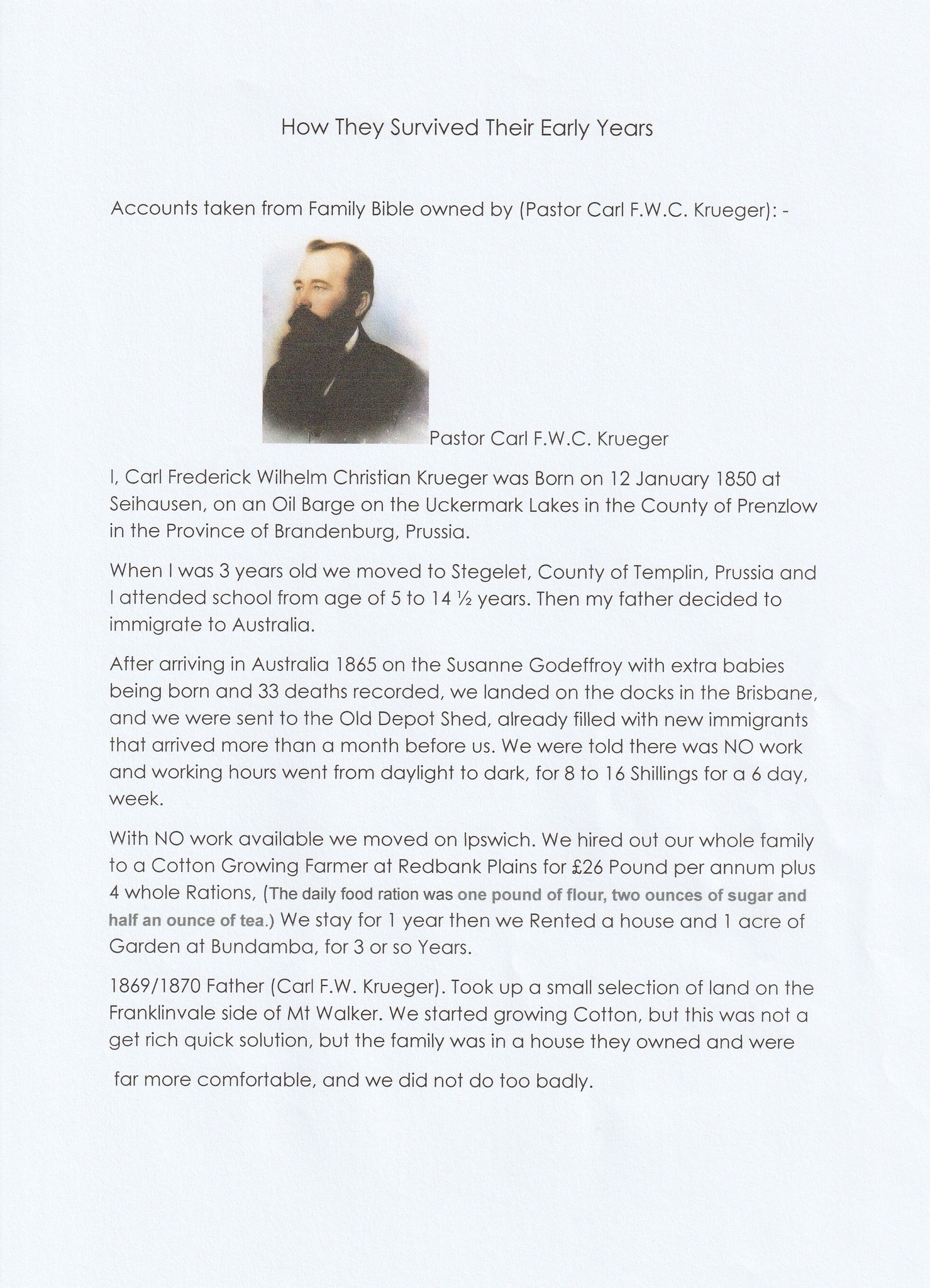 When Queensland became a separate colony in 1859, the Herbert Ministry named a Select Committee to research the question of immigration, and J.D. Lang who was very much in favour of German Protestants, recommended the bringing out of a set number of them each year. To promote this, the Govemment appointed a Brisbane wine merchant, J.C. Heussler, as Immigrant Agent in Germany, and promised free passage and other advantages, with the result that by 1864 the number of Germans in Queensland had doubled. With what amounted to a pretty good list of options available to them, as immigrants to a new colony on the other side of the world, the family decided to get out of Germany & head to a country, that they knew very little about.