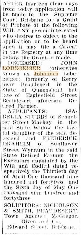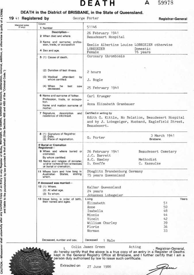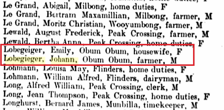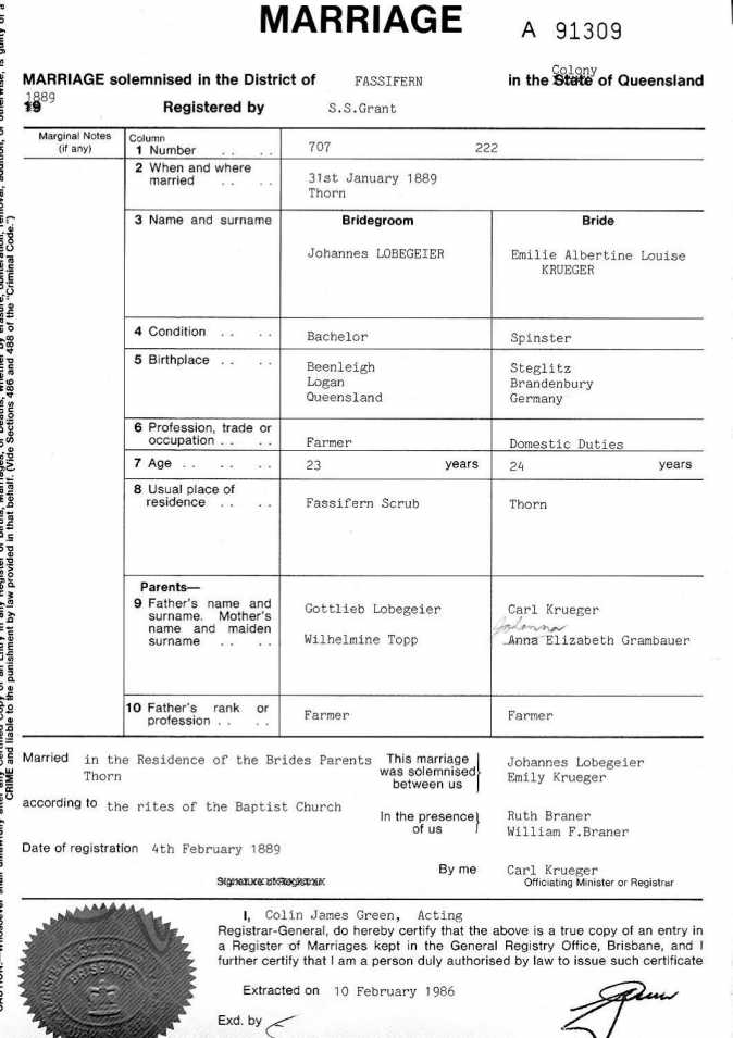 Gottlieb & Wilhelmine were married on October 6, 1850, in Templin, Brandenburg, Prussia, Germany. In many old German records, the family name is spelled Lobegeyer. When the spelling changed is unclear, but as with many old German names, the pronunciation and spelling were often modified upon arrival in English-speaking Australia. Record keepers and immigration officials frequently misspelled German names, which contributed to these changes.