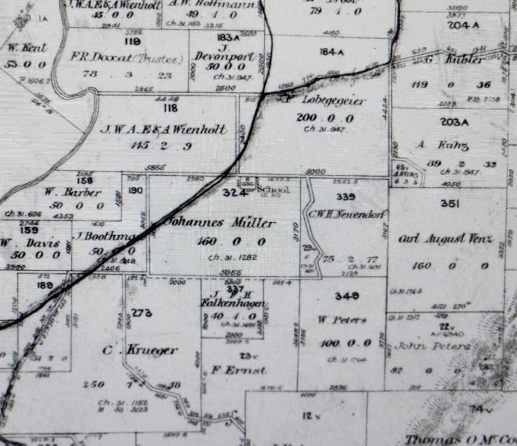 Our other ancestral families—Johannes and Louisa Muller (daughter of George and Louisa Kubler) and Carl and Johanna Krueger—were nearby neighbors of the Kublers, with their farms located in the same vicinity.