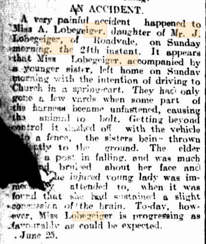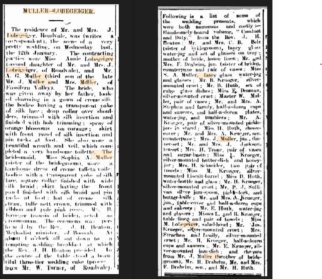 Adolf Gustav Muller (John & Louisa Rosina Muller’s son) married Annie Lobegieger (from Roadvale) on 12 January 1910.