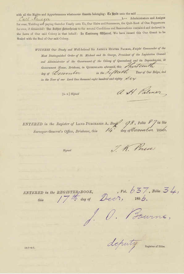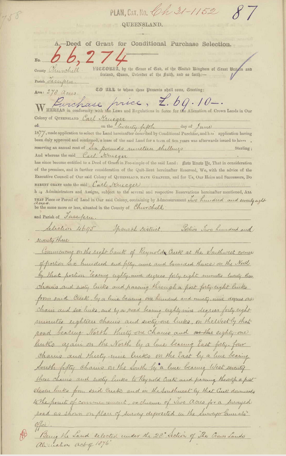 In Aug 1869 George applied for a 74 acre selection at Walloon on what is now known as Caledonian Road. His selection was portion 319 in the parish of Walloon (not far from the present day RAAF base at Amberley). He was issued with the deed of grant for this land in 1875.