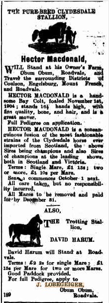 Alf Muller also represented his district in both cricket & football. Alf started Surradene Clydesdale Stud at his Fassifern Valley grazing property near Kalbar. The Fassifern district where he resided required a considerable number of horses to cultivate the land and the Clydesdale horse was chosen by the farmers for they had the size and stamina to cope with the task. During this period A.G.Muller owned several stallions and was breeding horses on his property. In 1931 he was elected as Queensland Branch President and Federal Delegate of the Commonwealth Clydesdale Horse Society. These positions he was to hold for 17 years until 1948 when the Queensland Branch of CCHS was disbanded. He was the longest standing President that the Queensland Branch has had to date. It is also recorded that he was a federal Clydesdale Judge from 1938 – 1948 officiating at the R.N.A. four times. (Thanks to – Ian Stewart-Koster for his research on this part of A G Muller’s life. My knowledge of horses, & Clydesdales in particular, is strictly limited)