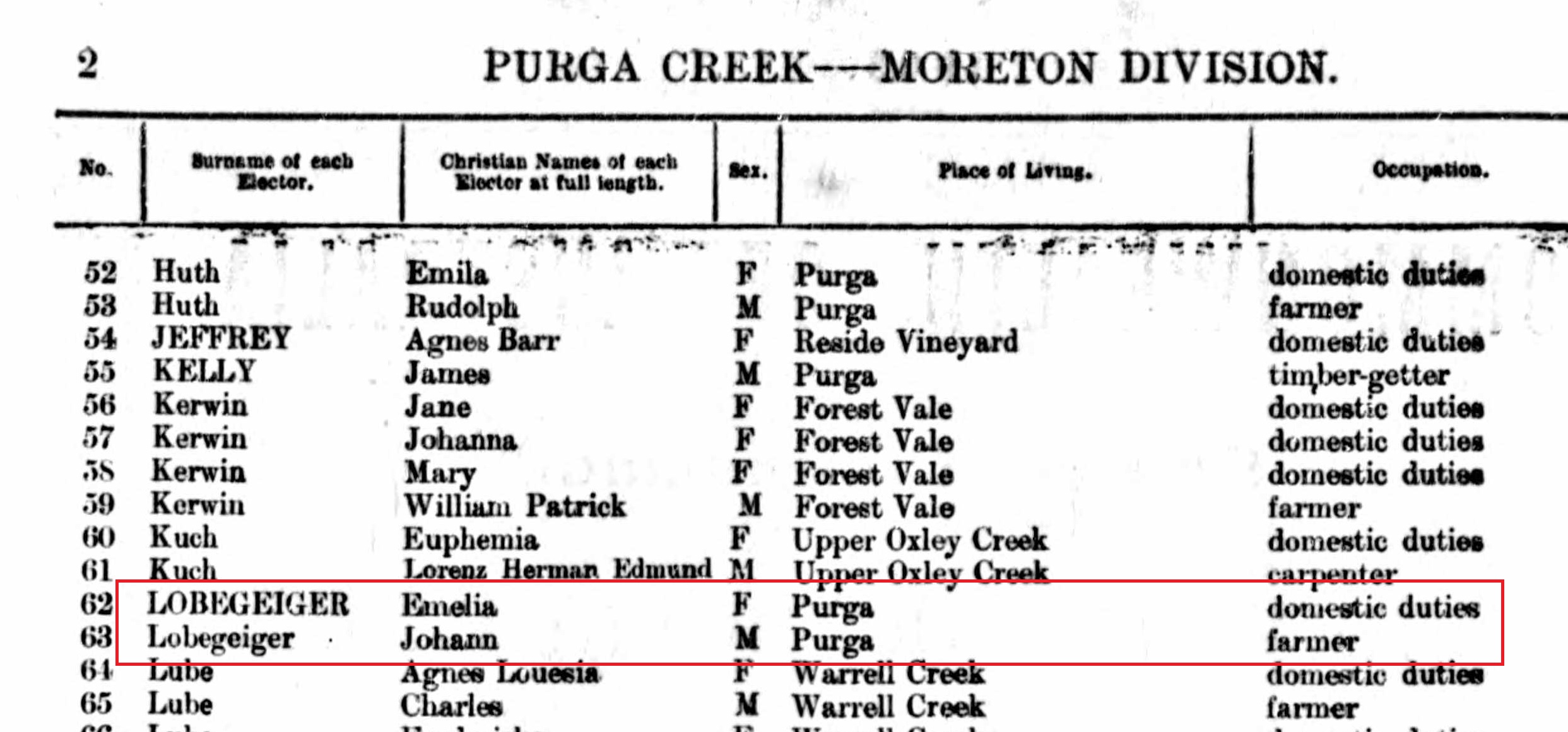 1876 electoral roll, shortly after the move to Fassifern Valley